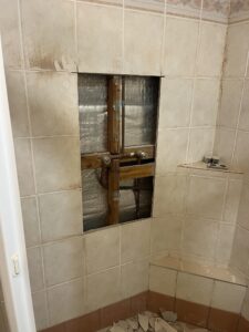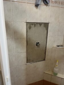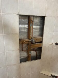 As part of a recent plumbing project, we were engaged to replace a faulty shower mixer in an ensuite bathroom. The process began with carefully opening the tiled wall to access the existing mixer valve and associated copper pipework, taking care to minimise disruption to the surrounding area.